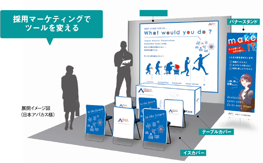 合同企業説明会や自社説明会などでの机や椅子を意識的にデザインし装飾することで、伝えたいメッセージや会社として大事にしていることを視覚的に訴求することができます。
