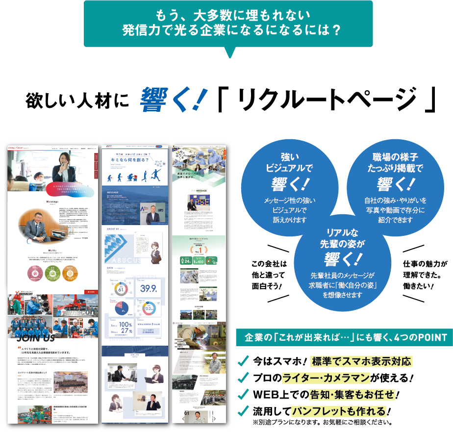 御社の商品やサービス、給与や勤務時間など、求人票で伝わる内容だけでなく、社長の志や情熱、人財育成への考え方、実際に働く社員の働き方や仕事への想いなど、御社の魅力を第三者の目線で最大限PRいたします。